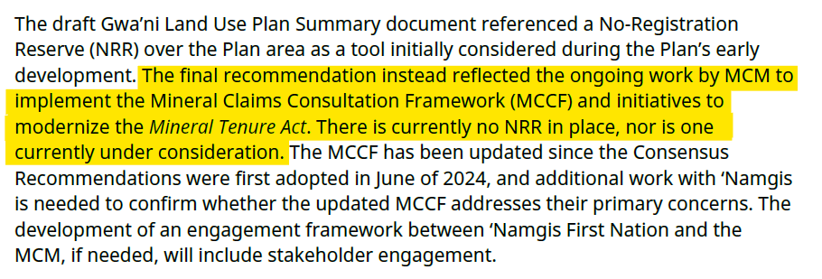In March 2026, we received a reply from the Minister of WLRS, Randene Neill. This letter acknowledged our recommendations and confirmed that no additional limitations for mineral exploration will be created for this area. See paragraph screenshot from the letter: